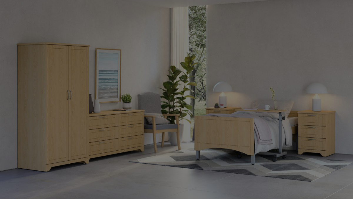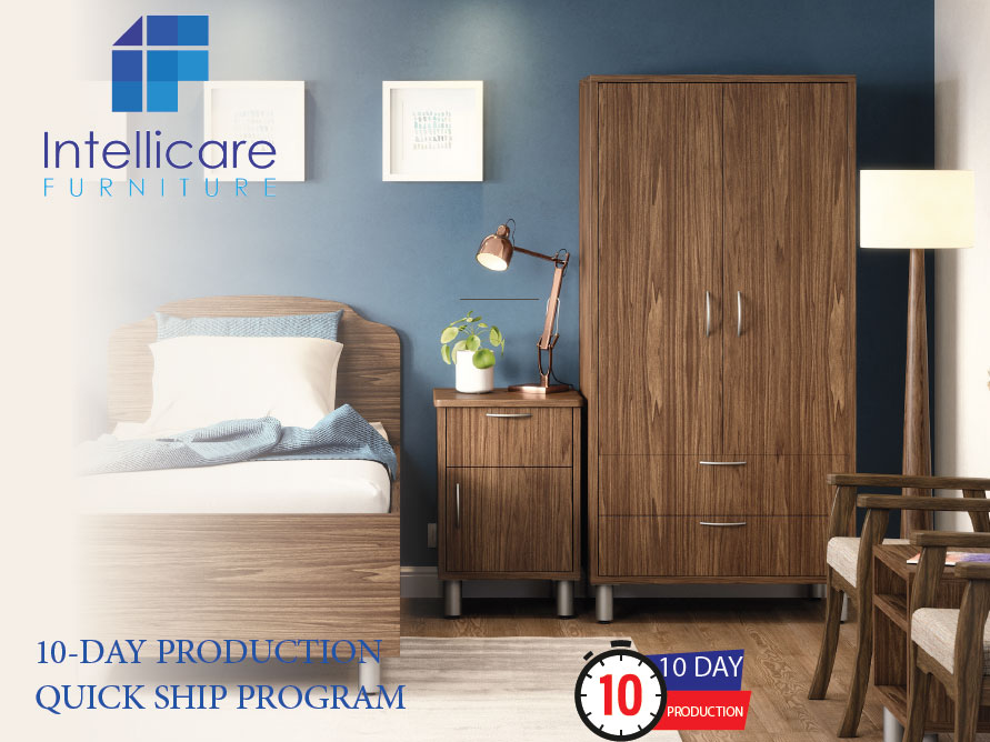 Intellicare Furniture’s Quick Ship Program oers over 75 long-term care furniture components with a 10-day production turnaround. Designed for assisted living, skilled nursing, and rehabilitation facilities, our Canadian-made products combine premium materials, beautiful finishes, and thoughtful design. All items arrive fully assembled (except for tables) and are backed by a lifetime warranty, ensuring lasting quality and peace of mind. Available in a range of styles, laminates, and finishes to suit any care environment.